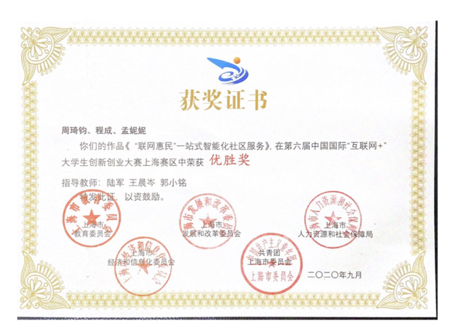 2、《“联网惠民”一站式智能化社区服务》项目,学生团队:周琦钧、程成、孟妮妮;指导教师:陆军、王晨岑、郭小铭。