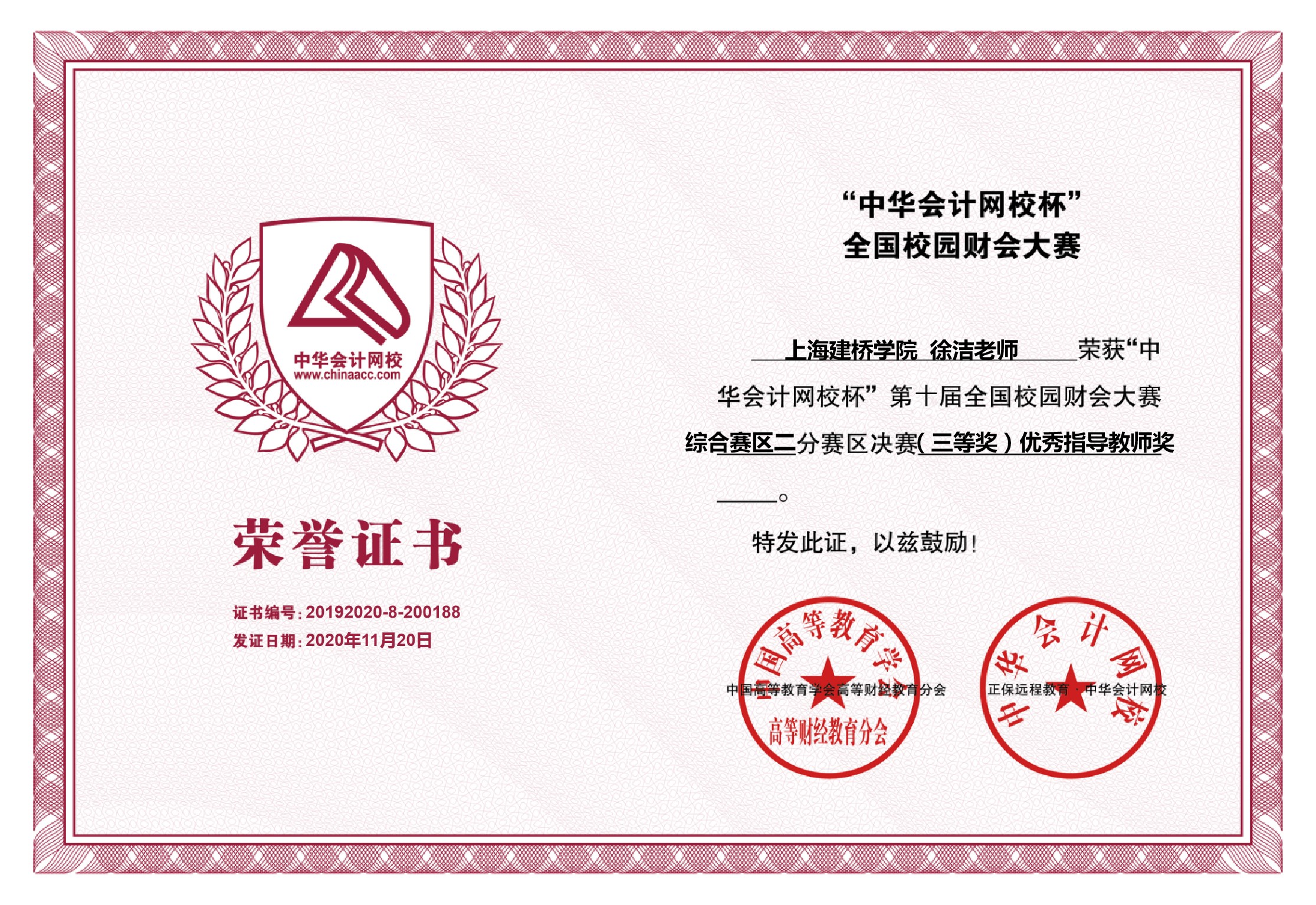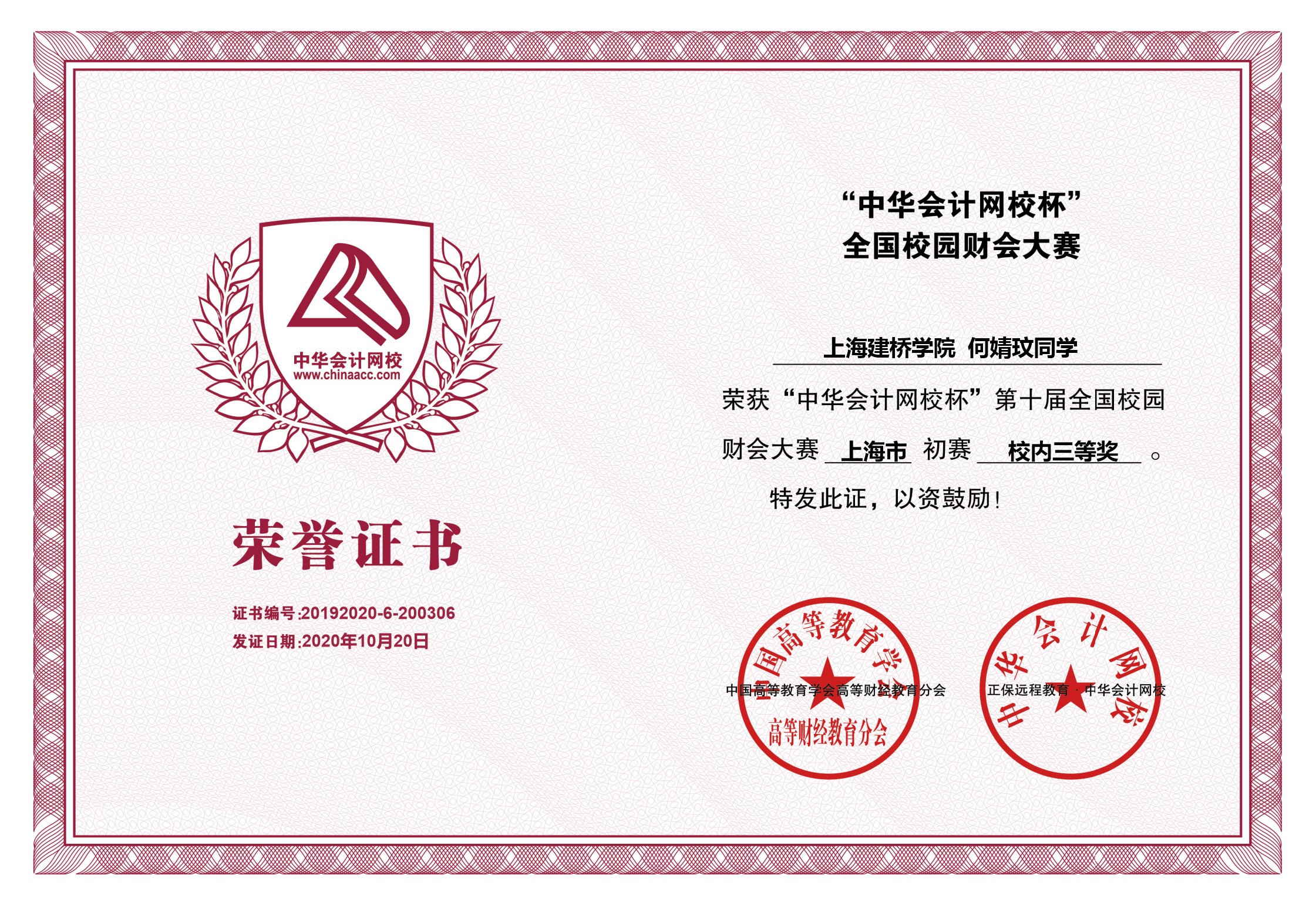 我院会计系黄怡婕、徐洁、刘姝老师指导,经过激烈的竞争角逐,取得良好佳绩:李田芸、刘映雪、吕金博获校内二等奖,何婧玟、郦嘉豪、余芳婷、赵姝媛、朱峻立同学获校内三等奖,其中,安定同学比赛成绩满分,获市内一等奖;段漫琪、胡澜、徐俊同学获全国综合赛区三等奖。