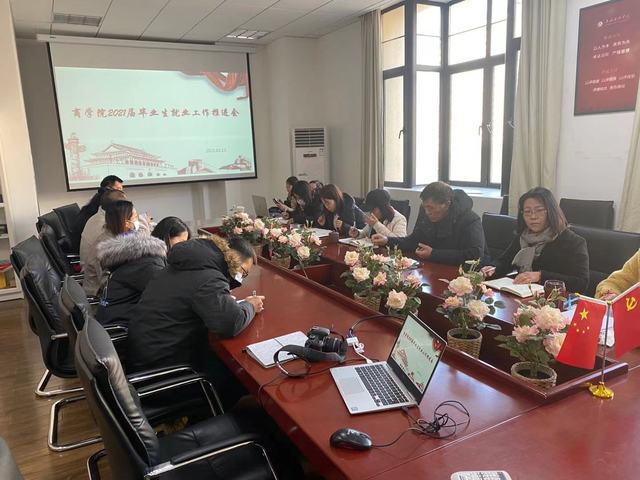 1月13日上午9:00,商学院于8305会议室组织召开2021届毕业生就业工作推进会议,商学院院长高健、党委书记刘爱香、副院长周英芬、尹卫华、党委副书记王晨岑、系主任及毕业班辅导员参加本次会议。