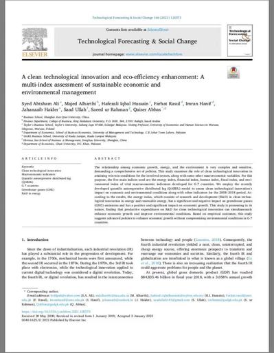 近日,商学院旅游管理系巴基斯坦籍专职教师Ali博士以第一作者,在《Technological Forecasting & Social Change》期刊上发表题为《A clean technological innovation and eco-efficiency enhancement: A multi-index assessment of sustainable economic and environmental management》的论文,该项研究由来自中国、巴基斯坦、沙特阿拉伯,马来西亚,波兰等国的学者合作完成,上海建桥学院为第一署名单位。
