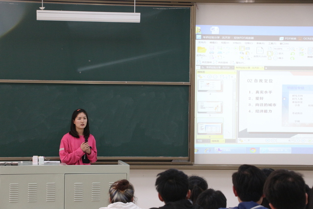 沈天珍学姐结合自己在考研期间的经历为在座同学们详细讲解了考研的必要和备考期间应注意的事项,包括考研各模块的任务分配、考研期间的复习方法、考研信心的树立、备考心态的调整、生活作息的安排以及专业选择的心得。她认为:考研虽难,但无需妄自菲薄,要坚定自己的信心,及时调整心态,减少不必要的活动,全力以赴备考!