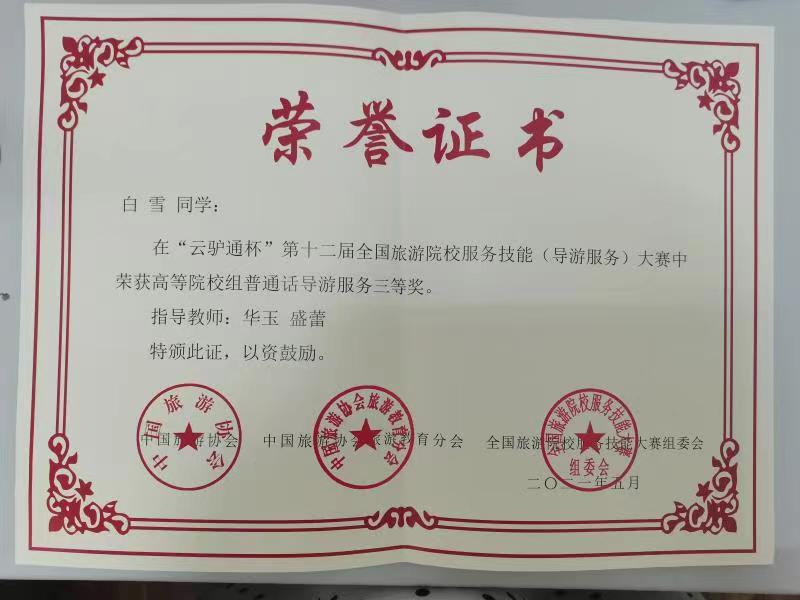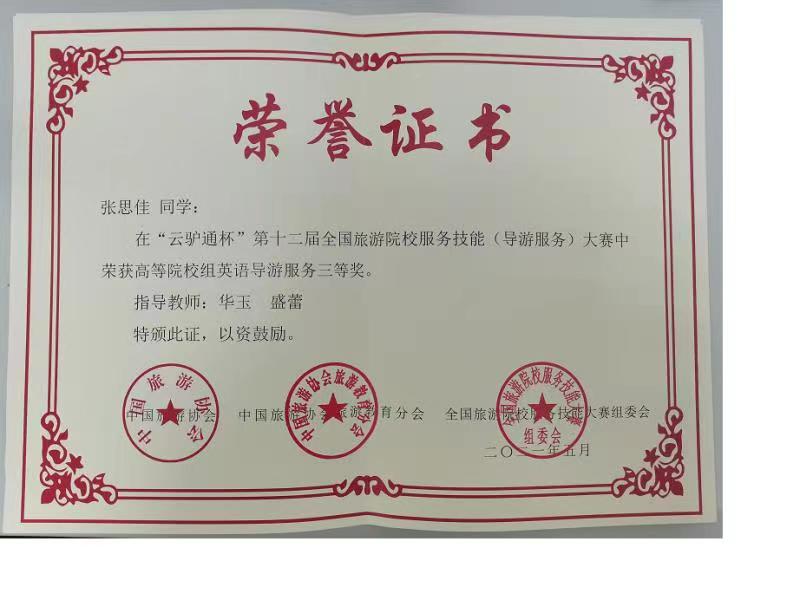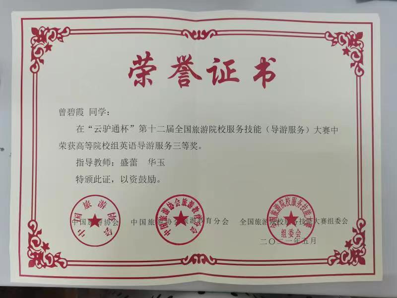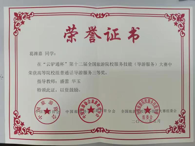 5月13日至16日,旅游管理系系主任华玉和盛蕾老师带队参加了“云驴通杯”第十二届全国旅游院校服务技能(导游服务)大赛。大赛是旅游专业院校中规格最高、影响力最广的专业赛事之一。本届比赛共有来自全国各地的345支参赛队伍、1037名选手报名参加。经过理论考核、模拟导游、才艺展示等三个环节紧张激烈的比拼,我校商学院旅游管理系参赛队伍获得团体三等奖、优秀组织奖,参赛选手葛潍嘉、白雪获得高等院校组普通话导游服务三等奖,张思佳、曾碧霞获得高等院校组英语导游服务三等奖。
