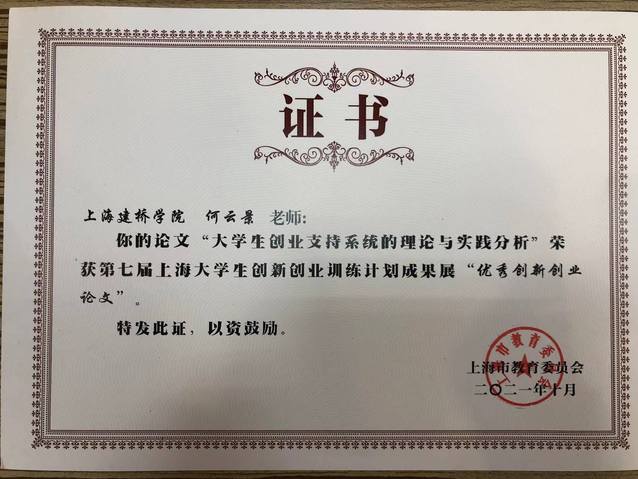 上海大学生创新创业训练计划成果展旨在展示上海高校创新创业教育成果,搭建学生学术交流平台,加强高校交流与沟通,展现学生创新创业风采。本届成果展共向31所高校征集97篇学生创新项目报告、46篇创业项目报告、97块创新创业项目作品、84篇创新创业训练计划案例和117篇教师论文。通过一系列评审,最终评选出最佳项目报告16项、最佳创业项目8项、我最喜爱的项目20项、最佳人气项目20项、优秀创新创业训练计划项目案例50项、优秀创新创业论文60篇。商学院何云景教授的《大学生创业支持系统的理论与实践》荣获“优秀创新创业论文”奖。