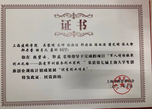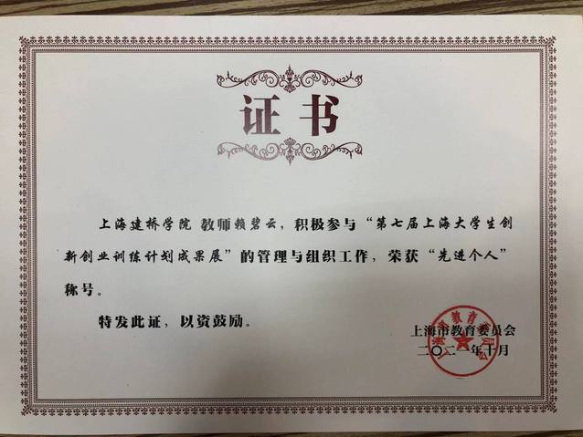 商学院一贯注重退伍军人复学后的专业能力培养和职业发展,电子商务专业教师赖碧云、郭薇指导的“军人情结凝聚成业之路”就是由10名退伍军人组成的创业项目,项目创立至今已经初具规模,业务扩展迅速,该项目在2021年“互联网+”上海赛区获得铜奖,在本次的成果展中获“优秀创业项目”奖;该项目指导教师赖碧云荣获“先进个人称号”荣誉称号。