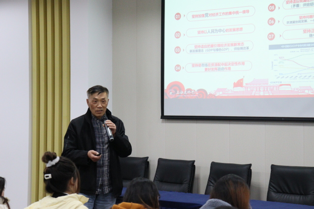 首先,高院长围绕新时代中国特色社会主义经济思想和经济高质量发展,向学员们指明:长期坚持、不断发展和合理运用马克思主义基本原理,是对中国特色社会主义经济学的理性概括,是党的精神财富。随后,高院长通过生动形象的图片,分别从“加快建设海洋强国”、“乡村振兴”、“发展壮大民营企业”等多个方面,为学员们详细讲述了“五位一体”发展战略和“创新、协调、绿色、开放、共享”五大发展理念。同时高院长鼓励学员们要紧跟时事,保护生态环境,参与到社会经济建设中,为经济发展贡献力量。