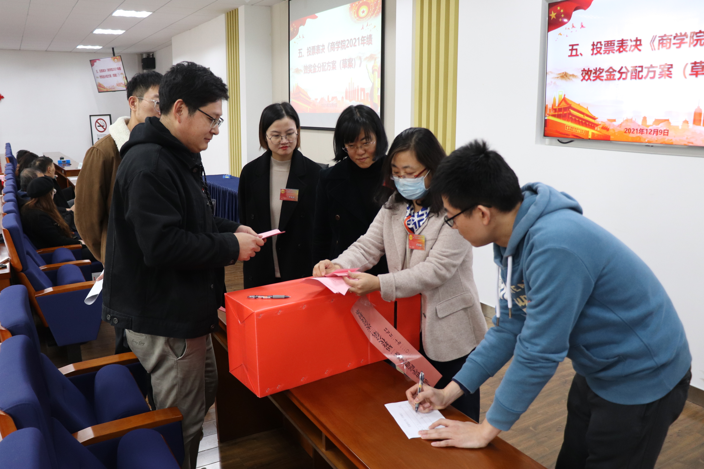 大会表决通过了大会工作人员名单及表决办法。并以无记名投票方式对《商学院2021年绩效奖金分配方案(草案)》进行表决,最终以全票通过了该方案。