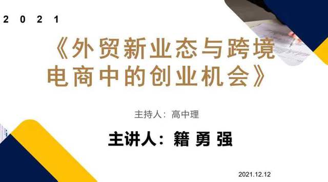 12月12日下午,商学院创新创业指导中心组织举办了主题为“外贸新业态与跨境电商中的创业机会”的讲座,邀请企业家籍勇强为商学院国际经济与贸易专业和电子商务专业大三学生做世界经济与贸易领域相关行业发展前沿动态讲座,受到学生听众的热烈欢迎。讲座由国际经济与贸易专业负责人高中理教授主持,此讲座是系列创业讲座课程之一,是持续深化产教深度融合、校企合作的落地措施,也是致力于建设国家一流本科专业的措施之一。