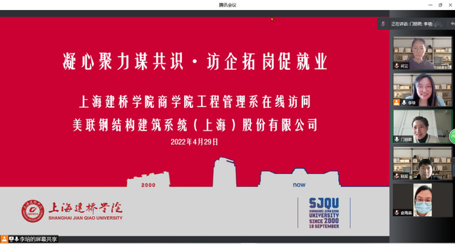 受疫情影响,本次专题活动采用了视频会议形式开展,商学院党委副书记俞海燕、工程管理系系主任李培、工程管理系22届毕业班辅导员陆军、何云及美联钢结构建筑系统(上海)股份有限公司(简称美联)领导参与了本次会议。会议由李培老师主持。