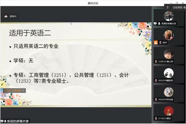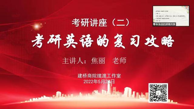 为进一步提振学院考研学子的备考信心,夯实英语基础知识能力,提高英语复习效率,5月22日晚上,学院邀请焦丽老师为考研学子作线上考研英语培训讲座,讲座由学院考证考研指导中心陆军老师主持,2019级、2020级意向考研的同学参加了本次讲座。
