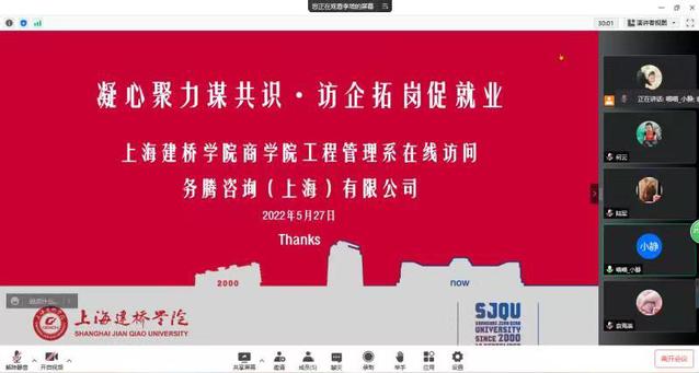 受疫情影响,本次专题活动采用了视频会议形式开展,学院党委副书记俞海燕、工程管理系系主任李培、工程管理系22届毕业班辅导员陆军、何云及务腾咨询(上海)有限公司(简称务腾咨询)的领导参与了本次会议。会议由李培老师主持。
