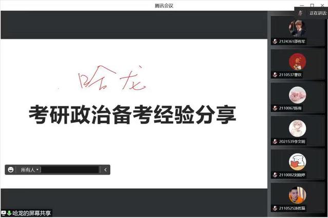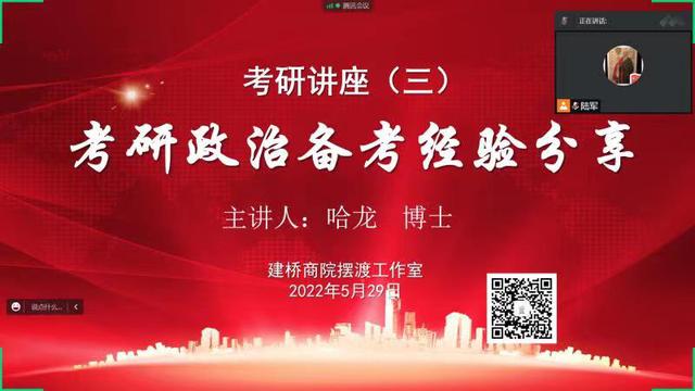 为了助力我院学子在考研中找准定位,明析考研政治规划,在考研过程中高效地复习,更好地找到走向目标学校的途径。5月29日晚上19:00,我院举行了线上考研政治辅导专题讲座,讲座由我校马克思主义学院副教授哈龙博士主讲,学院考证考研指导中心负责人陆军老师主持,2019级、2020级意向考研的同学参加了本次讲座。