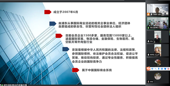 朱顾云副秘书长介绍了目前浦东国际商会有1500多家会员企业,服务范围15000多家企业以上,并对商会的具体工作内容做了详细说明,商会的会员服务部和策划服务部部长分别介绍了各部门的具体情况。