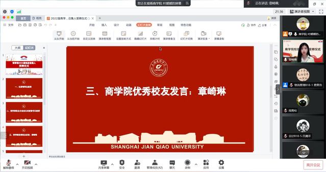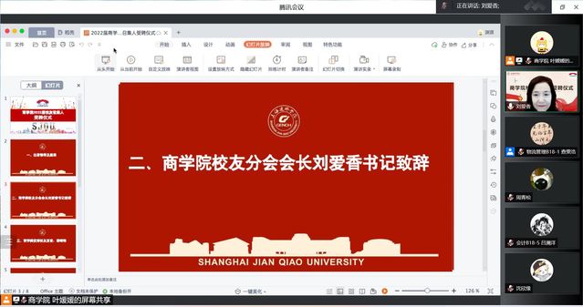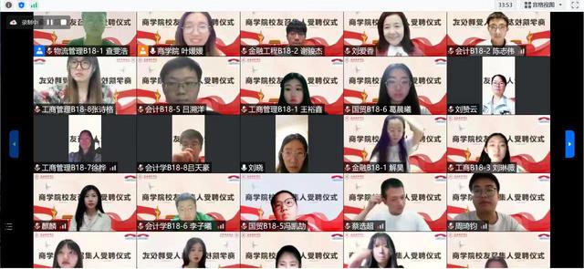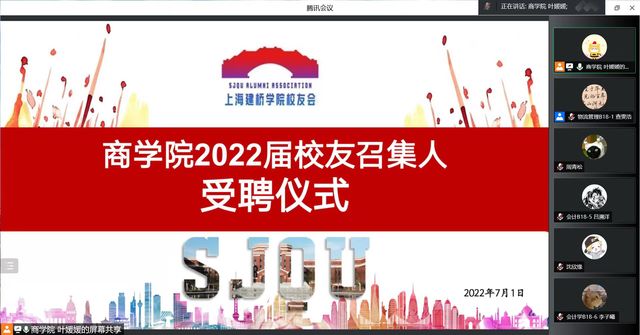 7月1日晚上,商学院2022届校友召集人受聘仪式通过腾讯会议线上举行。出席本次会议的嘉宾有:商学院党委书记,校友会分会会长刘爱香老师、党委副书记俞海燕老师、2022届毕业班辅导员们、商学院2020届校友总召集人章崎琳以及商学院校友会负责人叶媛媛老师。
