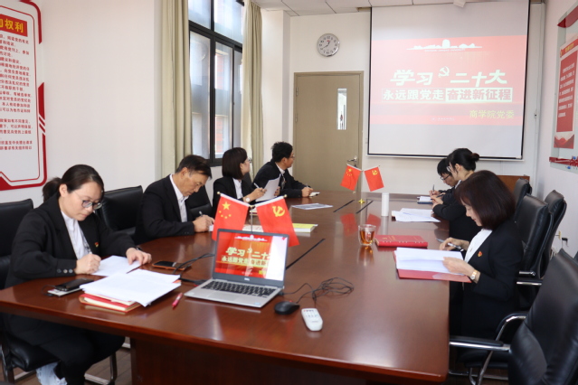 中国共产党第二十次全国代表大会于16日上午在人民大会堂胜利召开,习近平代表第十九届中央委员会向大会作了题为《高举中国特色社会主义伟大旗帜 为全面建设社会主义现代化国家而团结奋斗》的报告。学习宣传贯彻党的二十大精神是当前和今后一个时期的首要政治任务。10月17日,商学院党委召开专题学习会,集中学习二十大报告,并在认真学习原文的基础上,结合工作实际,谋划学院未来发展的目标和方向,着力推动二十大精神见实效。