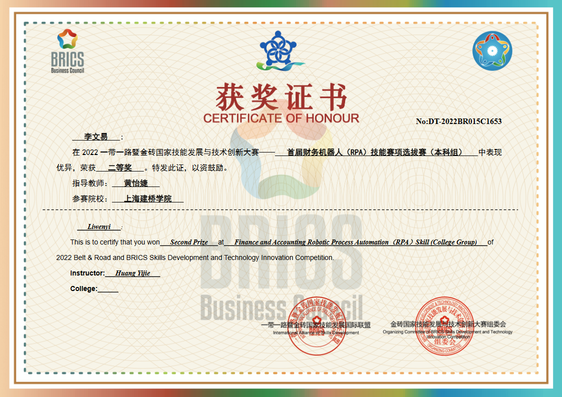 近日,2022年一带一路暨金砖国家技能发展与技术创新大赛——财务机器人(RPA) 技能赛项省赛落下帷幕。商学院会计学系同学克服疫情重重困难,经过激烈竞争角逐,喜获佳绩。其中,李婧、王子腾两位同学分别获得一等奖,龚子乾、何秉谦、李文易获得二等奖,桑灵萱、吴嘉奇获得三等奖。