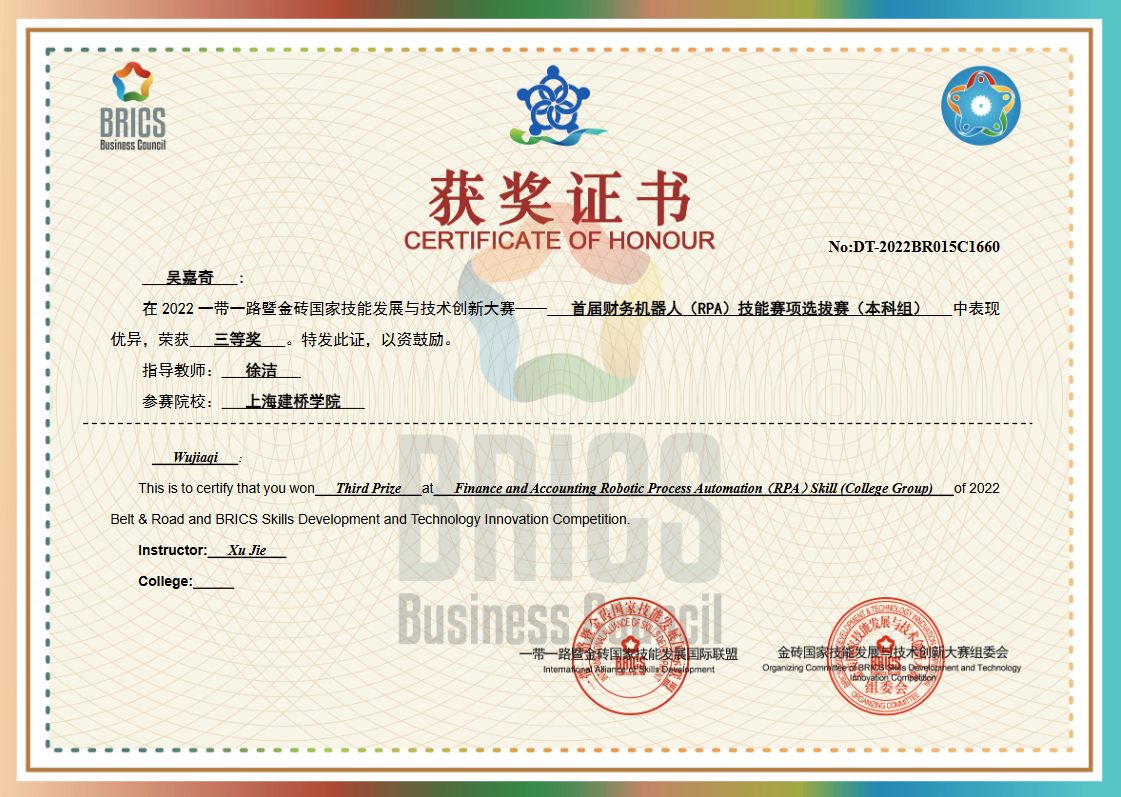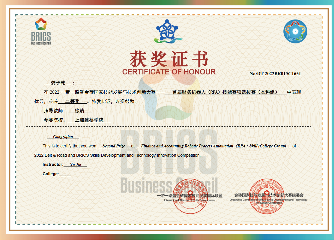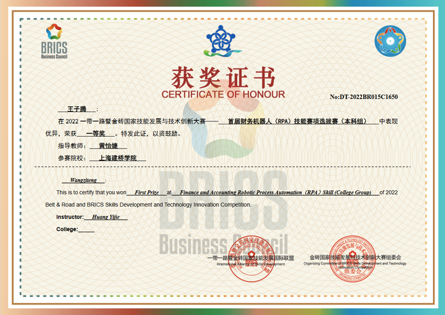 金砖国家技能发展与技术创新大赛(以下简称“金砖大赛”)是2017年金砖国家最高领导人会晤筹备委员会认可、经中华人民共和国外交部同意、金砖国家工商理事会批准的国际大赛。其中,财务机器人(RPA)技能赛项是中国科学技术协会一带一路暨金砖国家技能发展与技术创新培训中心以赛代培项目,考察参赛选手对智能时代下的财务转型、RPA财务机器人开发入门、使用 AutoWork开发财务机器人的知识与操作能力,旨在展示教育改革成果,全面提升教学质量。