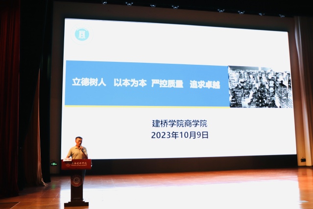 随后,高健院长就商学院总体建设情况为大家做了简单介绍。他指出:商学院始终将“以人为本,质量为先,依法治校,严格管理”作为质量方针,围绕应用技术型人才培养目标,培养有社会责任感与职业道德、具有创新意识、有核心就业竞争力的人才。同时坚持以学生需求与发展为导向,构建五育并举,全员全方位全过程人才服务模式。他勉励各位新同学要做到“自强不息、厚德载物”,坚守“感恩、回报、爱心、责任”校训,愿大家可以锤炼人格、克服惰性、磨练意志、不断进取!