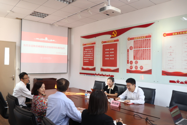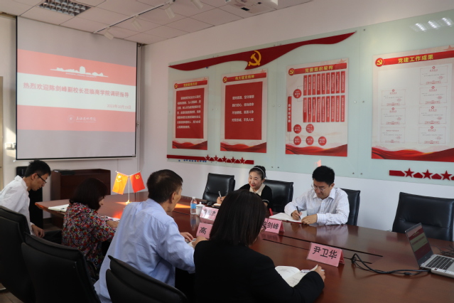 为深入贯彻落实党的二十大精神,加强校院两级联动,推动学校高质量发展。10月19日,副校长陈剑峰在校办副主任党松杰的陪同下莅临商学院调研指导工作。商学院党政领导班子院长高健、书记刘爱香、副院长尹卫华以及办公室主任徐光硕出席会议。