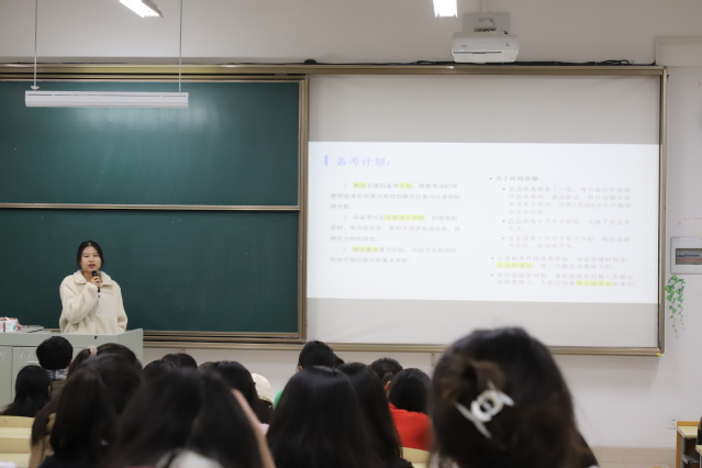 第二场分享会由倪雯丽主讲,她从备考计划、复习方法、考试经验和心态调整这四个方面进行分享。备考计划从择校开始再到学习时间分配和作息表方面来介绍,倪雯丽着重向大家推荐了她自己的作息表。复习方法介绍了英语,政治和专业课的复习。考试经验方面她强调要在考试前做好解压准备,选择合适自己的考研资料,注意时间管理以及题型特点。心态一定要不断地去调整,相信自己,坚持到最后,不断调整学习方法和节奏。