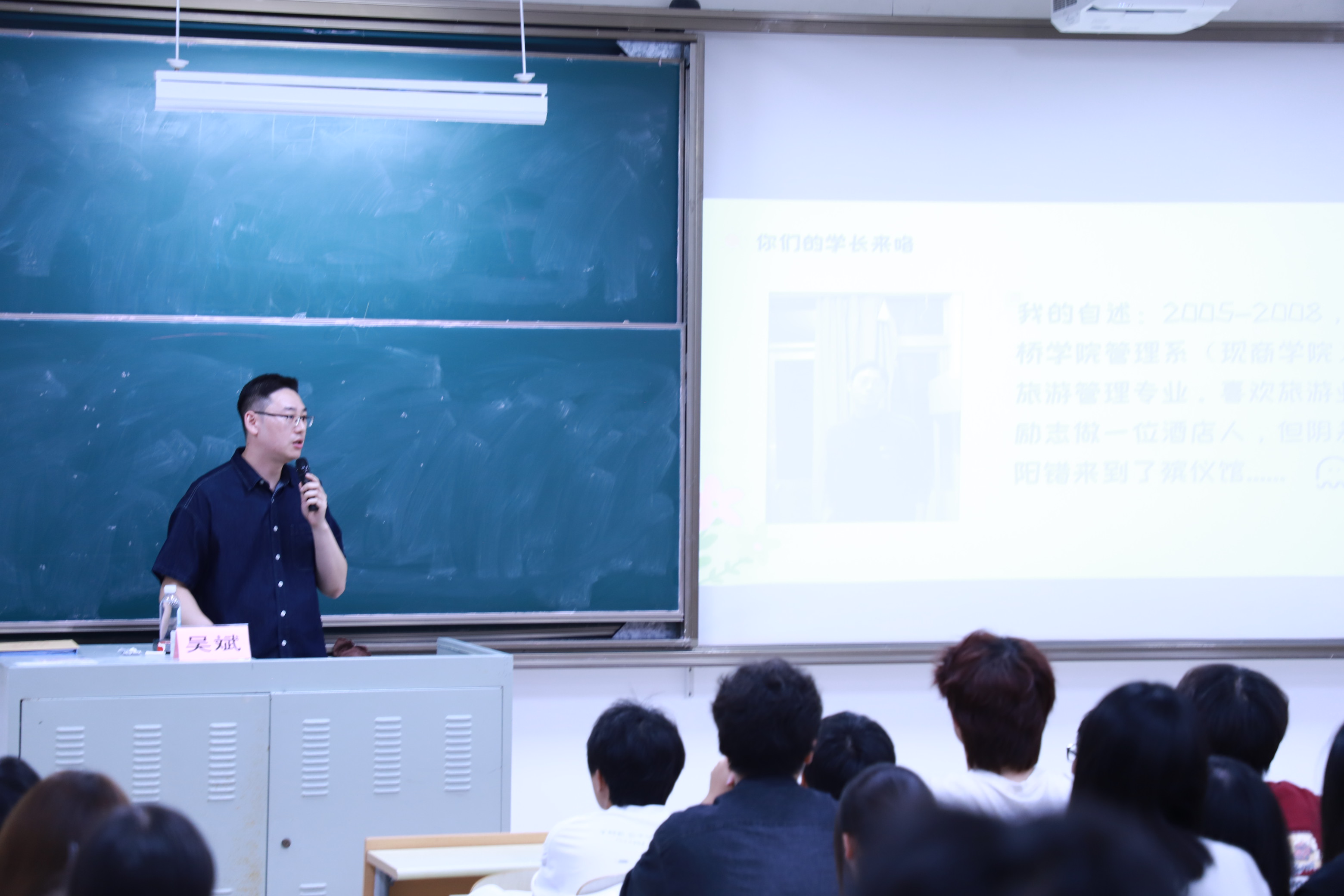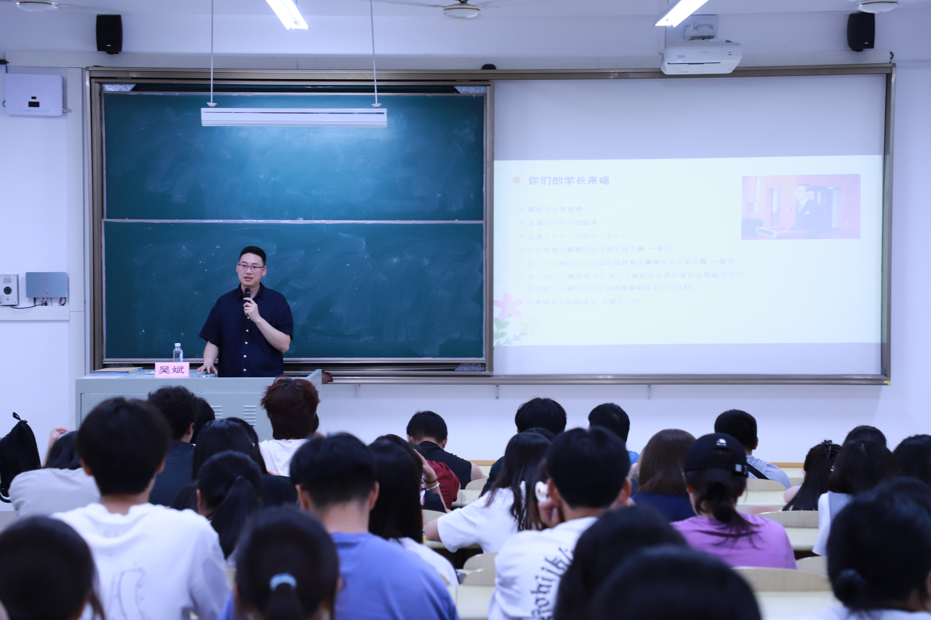 2025年9月24日晚上18:30在一教204,上海建桥学院商学院2008届旅游管理专业优秀校友吴斌重返母校,为大一新生带来一场题为《开启你的“盲盒”大学生活》的专题讲座。现任上海市民政局团委副书记、上海市殡葬服务中心团委书记的吴斌,结合自身大学经历与职场感悟,以亲切而深刻的分享,为初入校园的学子们绘制了一幅充满启示的成长地图。