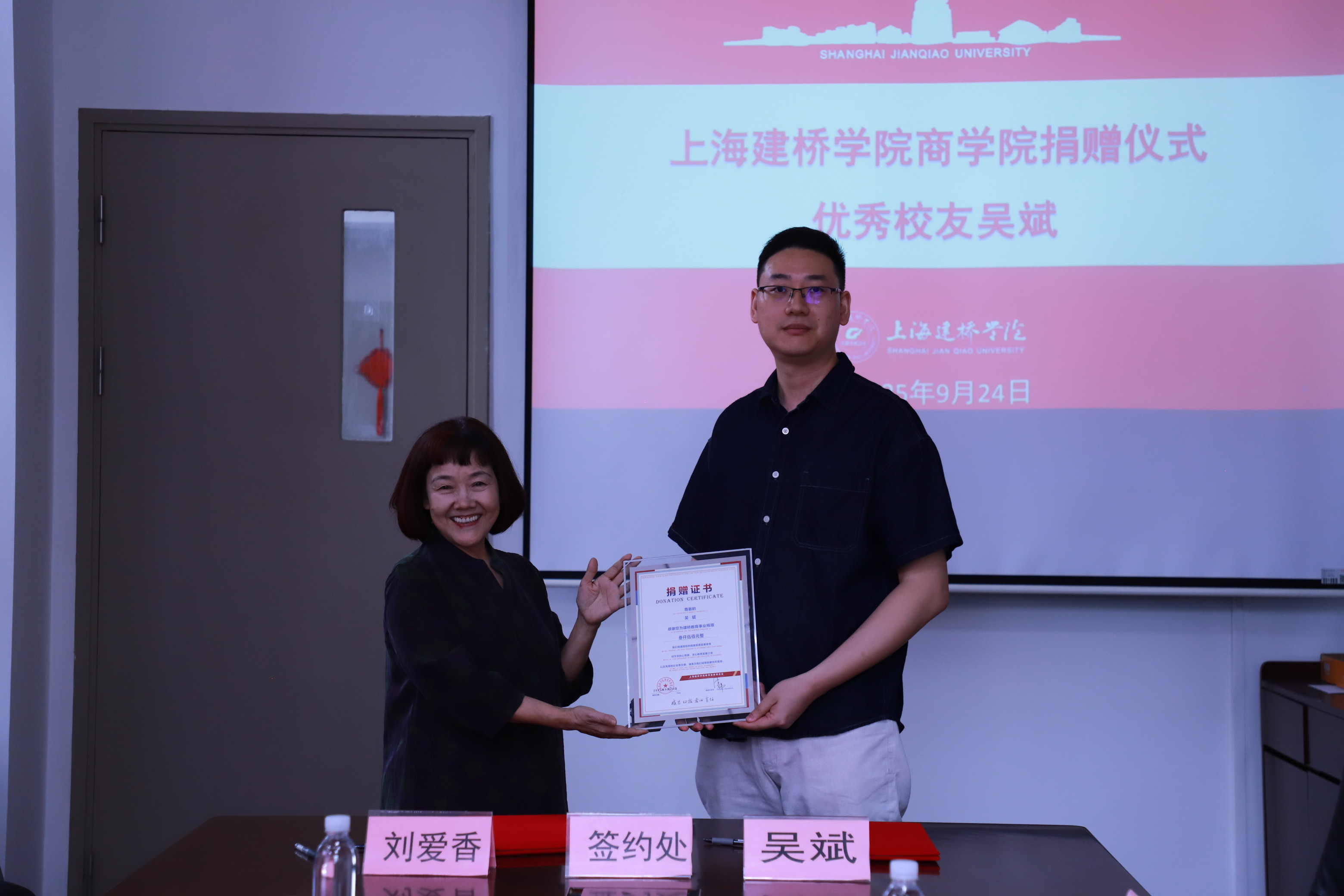 2025 年 9 月 24 日下午,上海建桥学院商学院 “启航 —— 吴斌校友一对一助学奖” 捐赠签约仪式在商学院333会议室圆满举行。商学院党委书记兼校友分会理事长刘爱香,商学院党委副书记兼校友分会副理事长俞海燕,上海建桥学院教育发展基金会副秘书长李业鹏,商学院校友分会秘书长叶媛媛、潘兰兰,商学院辅导员杨孟杨,以及 25 级会计学专业受助学生共同出席仪式。