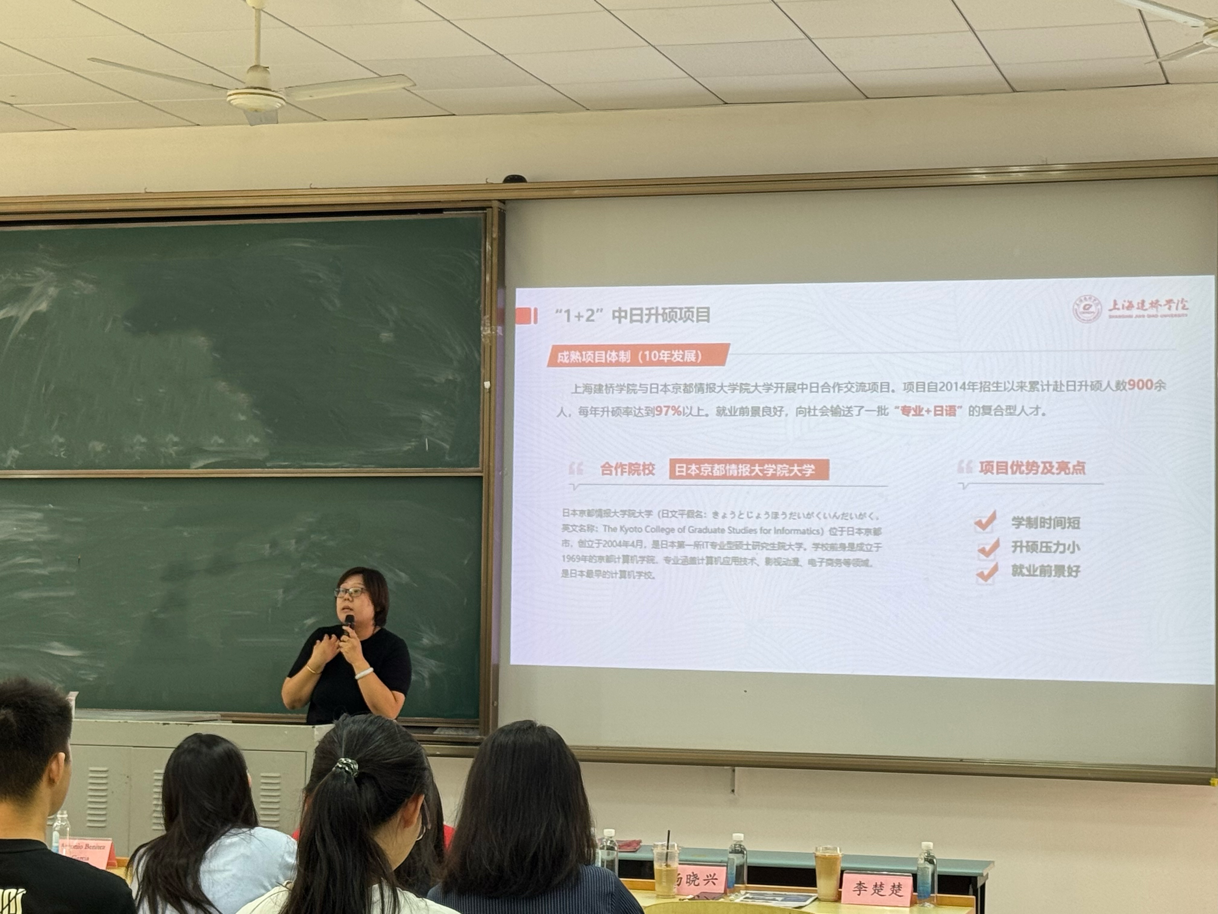 宣讲会正式开始,各高校招生负责人通过PPT展示、视频播放、现场互动等多种形式展开分享。上海师范大学商学院研究生项目负责人、西交利物浦大学研究生项目负责人、瑞士教育集团留学项目负责人以及我校国际教育学院代表的日本京都情报大学“1+2”项目负责人先后重点解读了2026年硕士研究生招生政策调整、推免生选拔标准及夏令营活动安排,强调了各自在学科建设、人才培养等方面的优势,鼓励更多优秀学子报考。