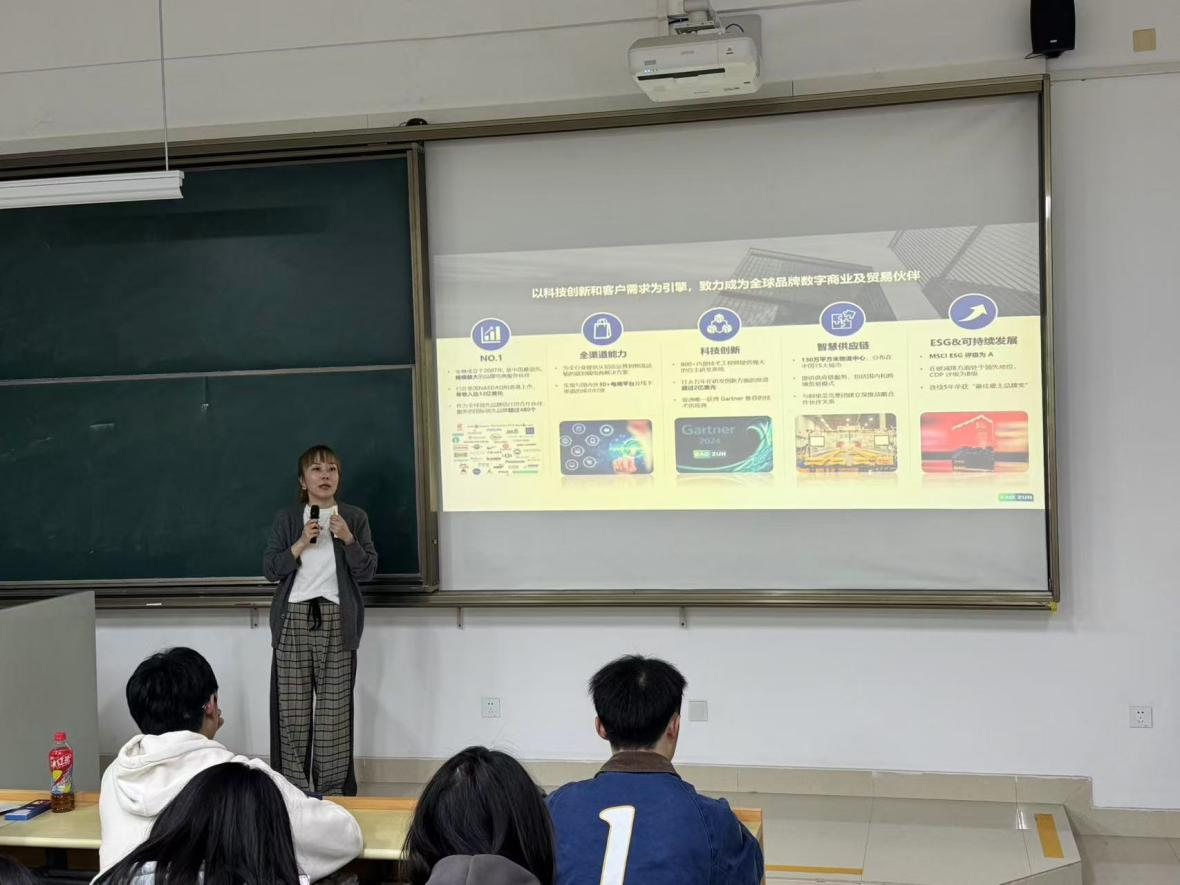 2025年10月28日晚7时,宝尊电商专场招聘宣讲会在我校四教208成功举办。宝尊电商校园招聘负责人瞿灏琼从宝尊电商的发展脉络、主营业务、行业规模、宝尊新青年项目、晋升机制和招聘岗位六个方面进行了介绍。