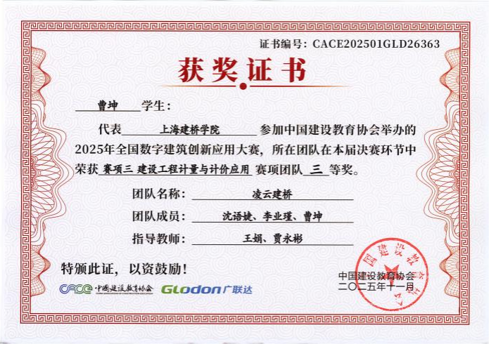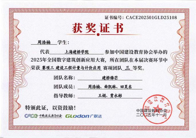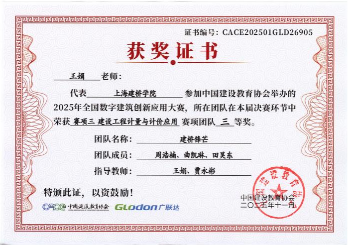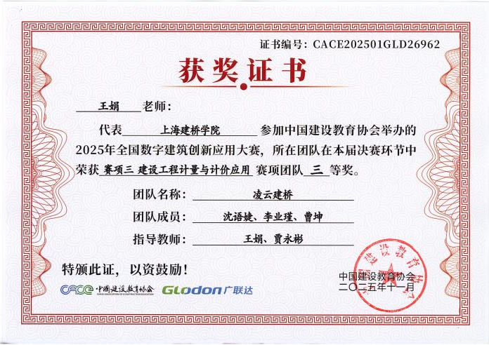 2025 年11月全国数字建筑创新应用大赛全国总决赛落下帷幕。上海建桥学院商学院工程管理专业学子凭借扎实的专业功底、出色的实践能力和默契的团队协作,在建设工程计量与计价应用赛项中脱颖而出,一举斩获两项三等奖,为学校赢得了荣誉。