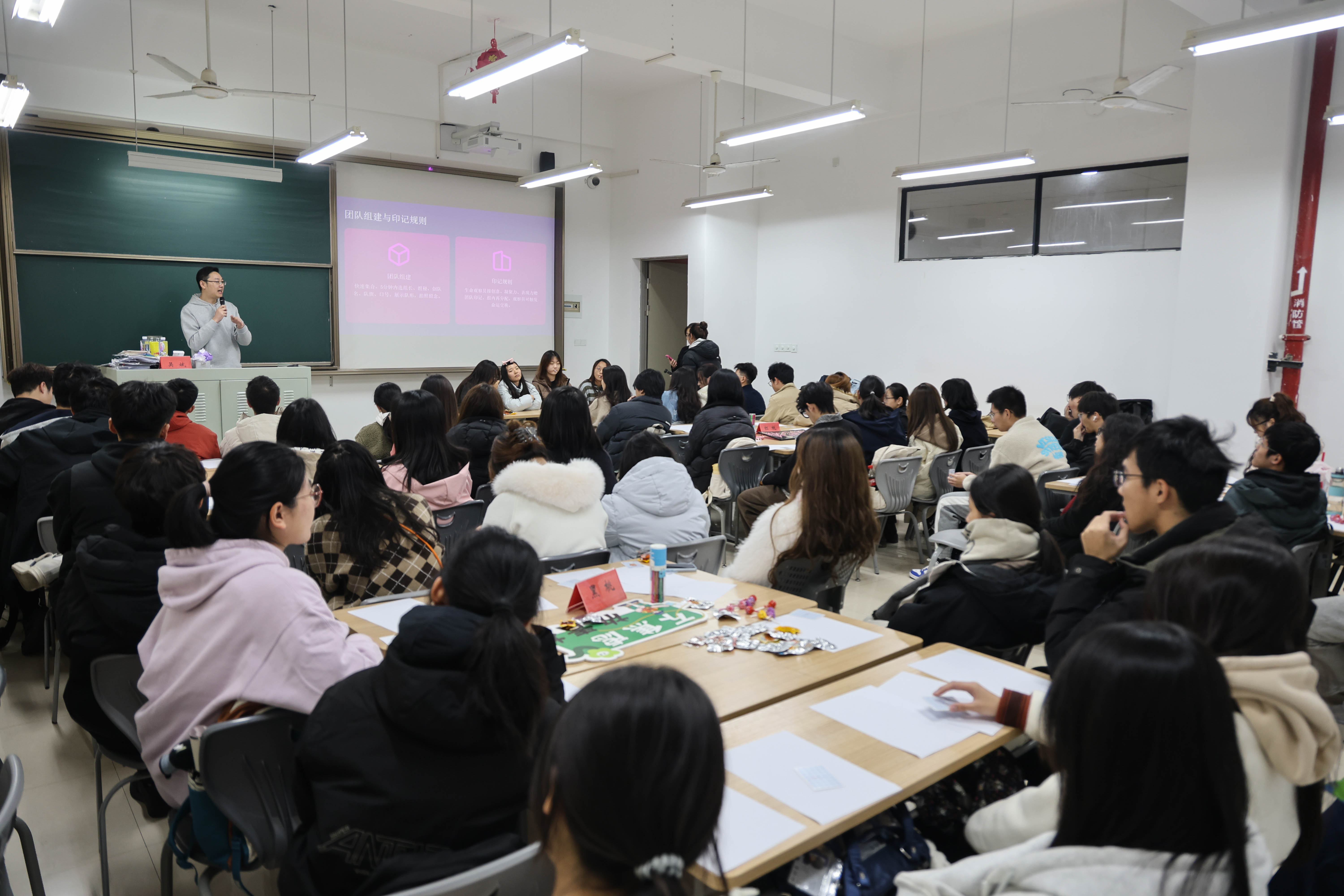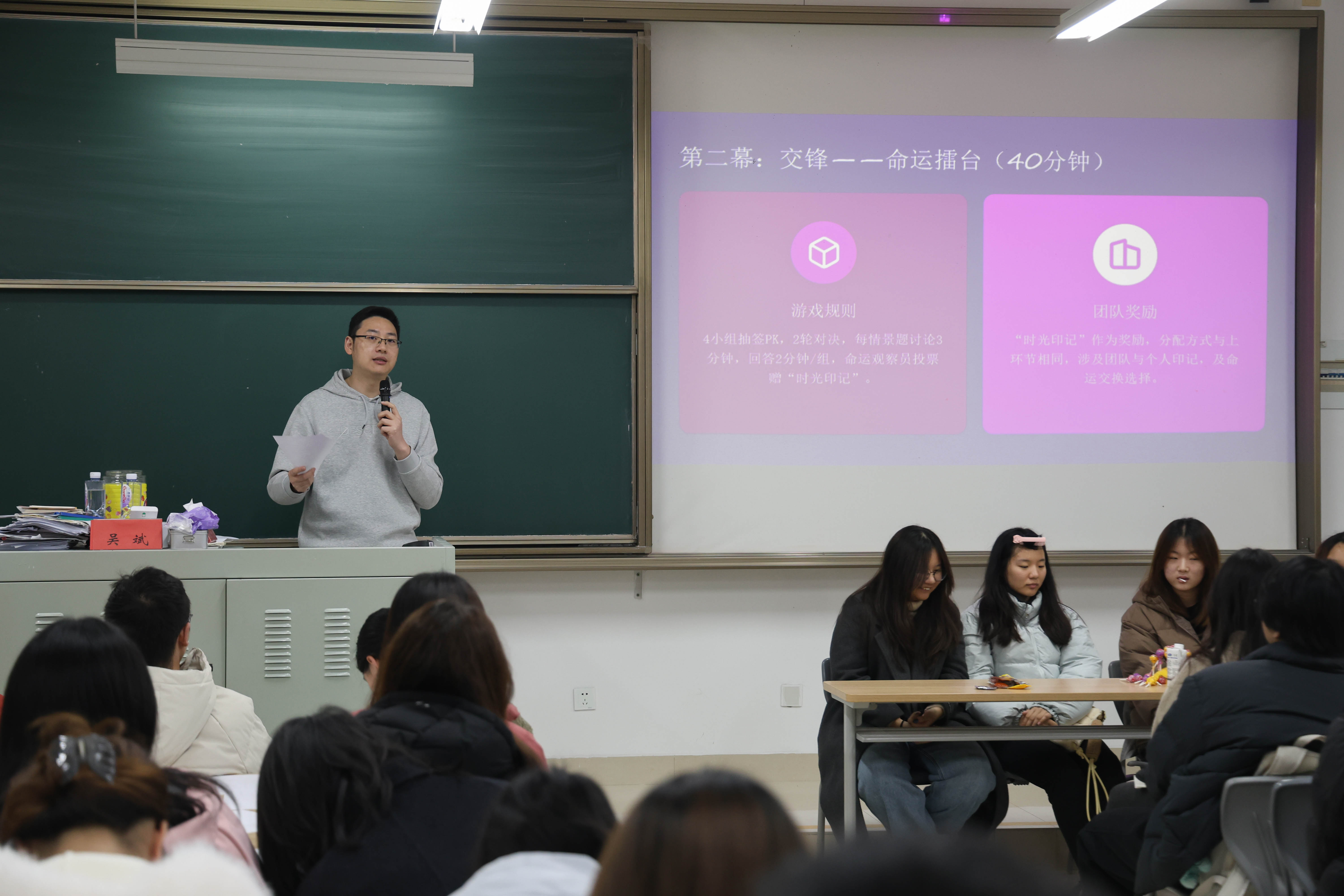2025年12月7日,上海建桥学院商学院在教学楼多功能教室开展了一场别开生面的生命教育活动。2008届旅游管理专业校友、上海市民政局团委副书记、上海市殡葬服务中心团委书记、上海市宝兴殡仪馆职工吴斌重返母校,以“时光副本・抉择纪元——沉浸式剧本杀”为载体,通过角色扮演、团队协作、价值思辨与仪式承诺,引导学生在高度参与和情感共鸣中,深入思考个人规划、团队责任与生命价值。