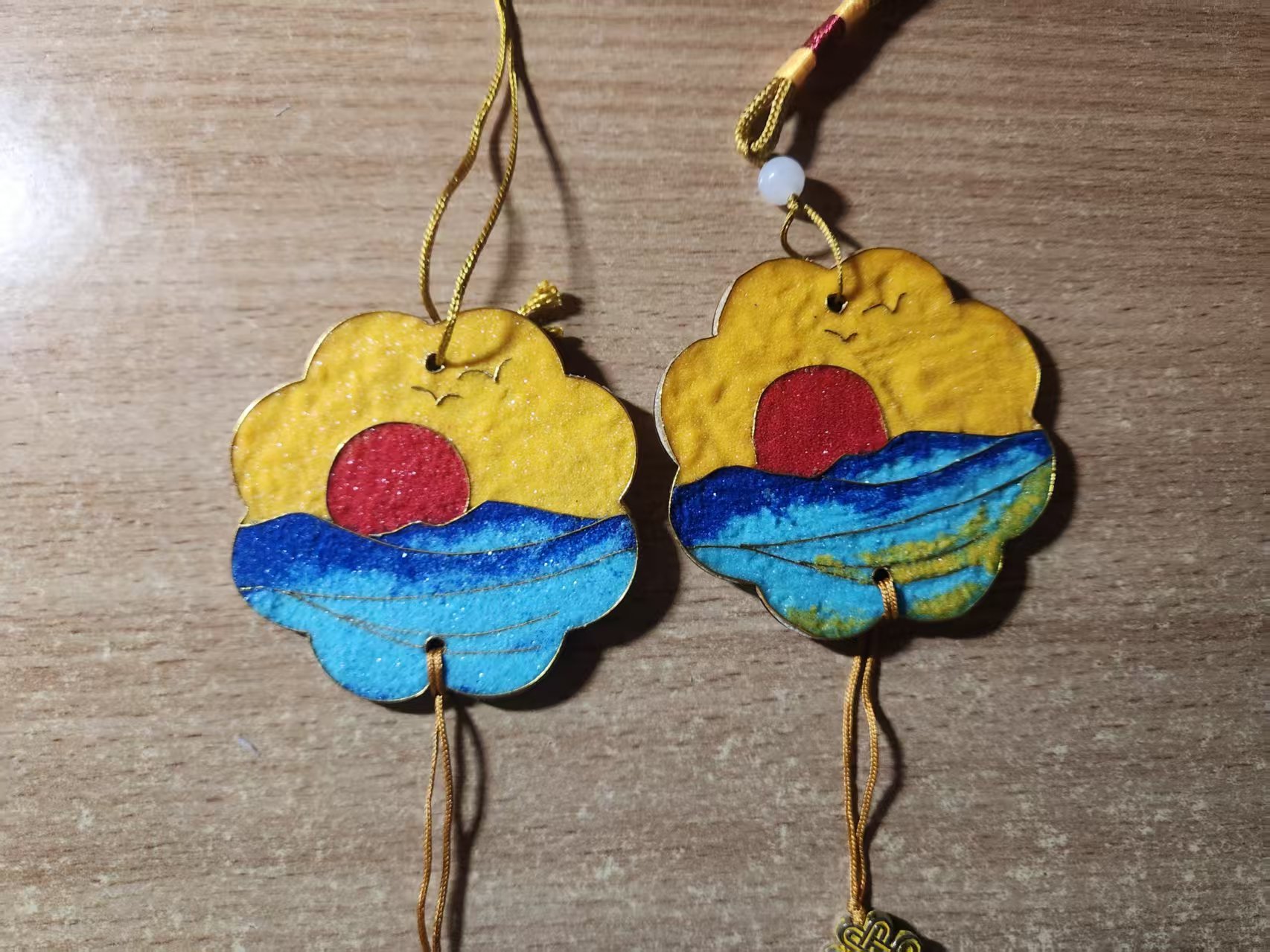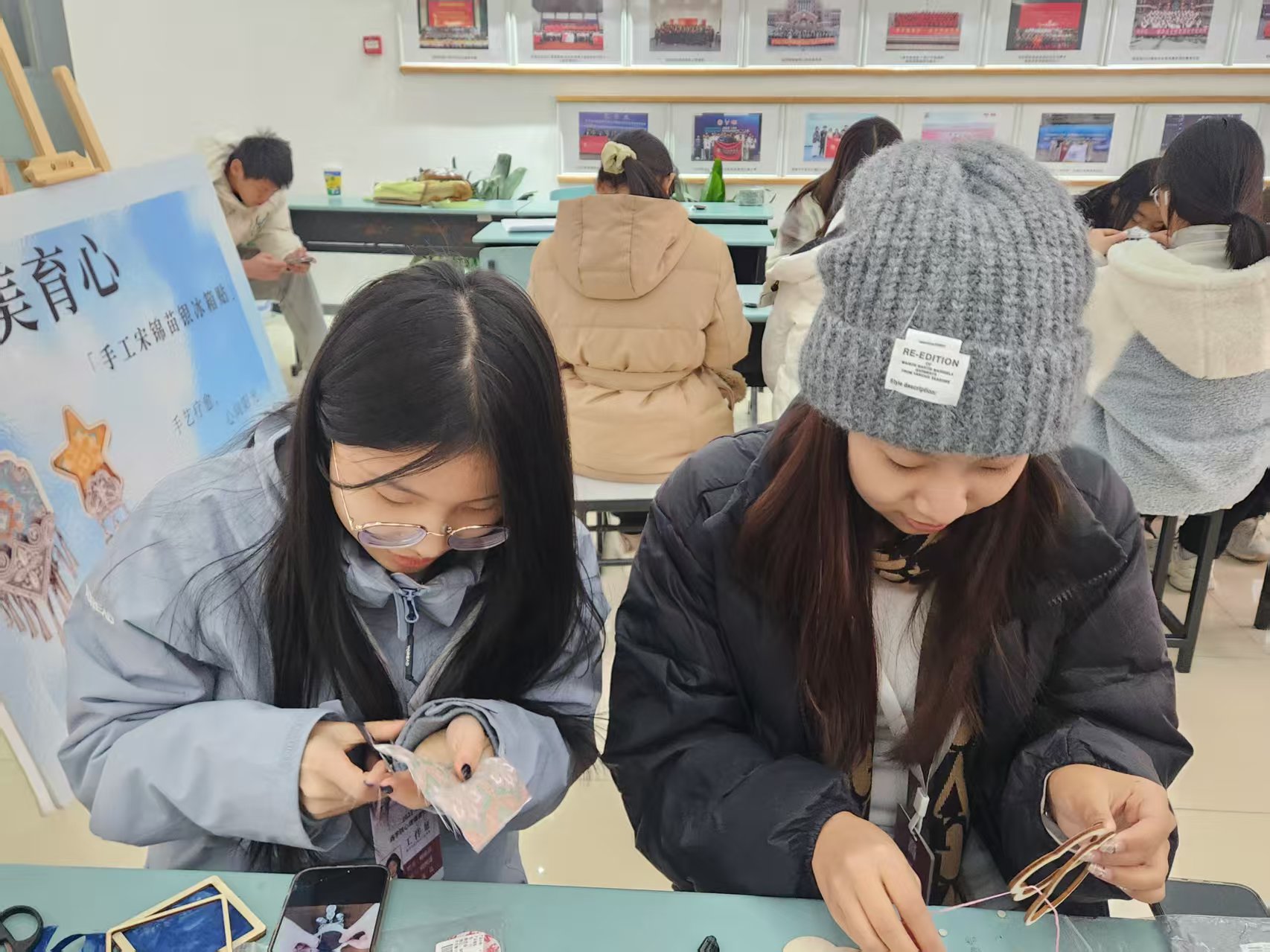同学们专注投入,沉浸式解锁非遗技艺:指尖弯折银丝勾勒灵动轮廓,细调彩砂晕染独特肌理,亲手打造专属的宋锦苗银冰箱贴与掐丝珐琅挂件。创作时专注当下,学业压力与焦虑悄然消解;交流中分享灵感、互授技巧,朋辈支持的暖意悄然流淌。