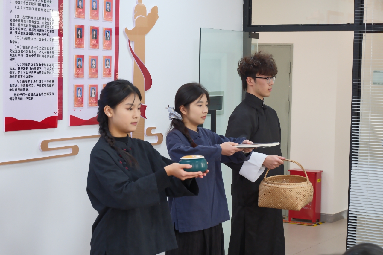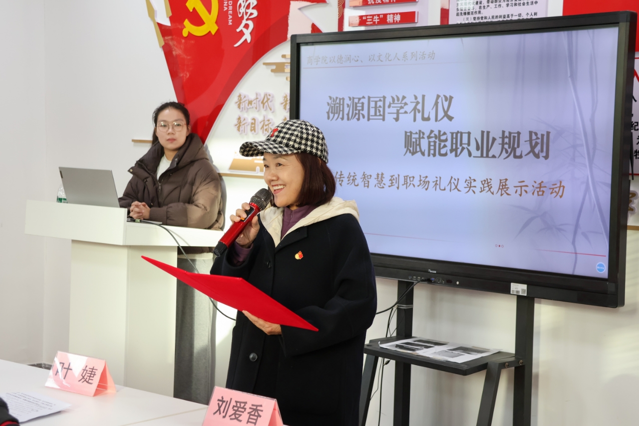 商学院作为教育部立德树人机制综合改革试点院系,始终秉持“以德润心、以文化人”育人理念,构建多层次文化育人与学风建设融合矩阵。在学风节系列活动深入开展之际,近日,“礼承国学精粹 培育职业新人 涵养优良学风”职业礼仪展示活动在社区一站式学生活动中心205举办。学院党委书记刘爱香、副书记俞海燕、教工第一党支部教师及部分学生代表参加本次活动,以古礼新实践探索“礼仪育德+学风提质”的立德树人新路径,为学风节注入传统文化与职业素养融合的鲜活力量。