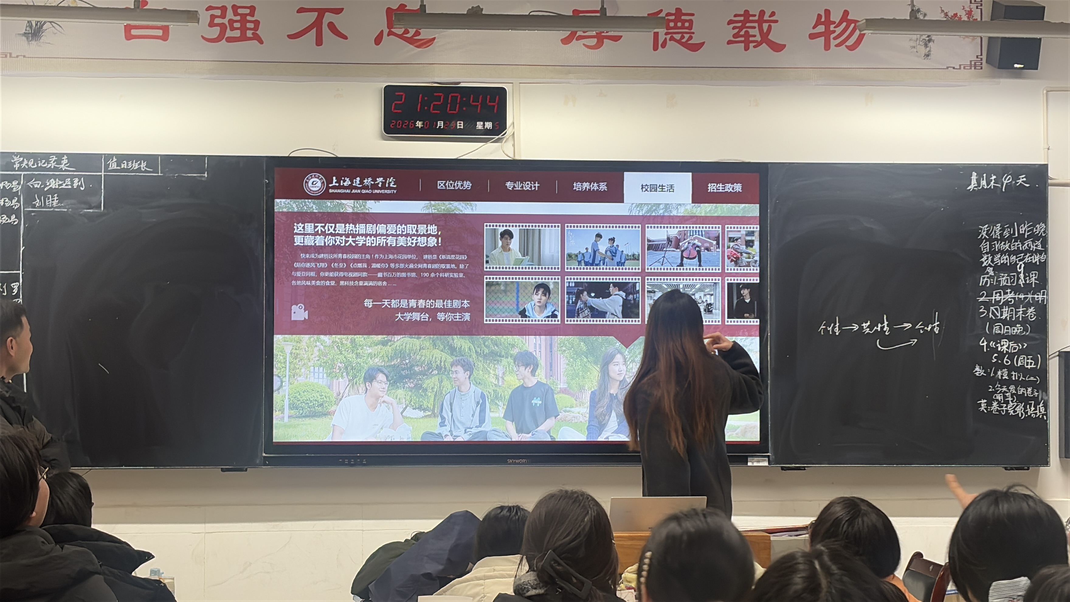 宣讲伊始,王彬入便结合自身感受,解读了建桥的区位优势:“建桥地处上海浦东,紧邻诸多主流媒体与互联网平台,这为我们新闻学专业的学子提供了得天独厚的实践条件,无论是实习就业,还是行业交流,都有着不可替代的优势。”随后,她结合新闻学专业设计,详细讲解了建桥的培养体系:“学院的新闻学专业,注重‘理论+实践’双提升,不仅开设新闻写作、新闻摄影、新媒体运营等核心课程,还搭建了校园电视台、校报、官方公众号等实践平台,让我们从大一开始就能动手实操,锻炼专业技能。”