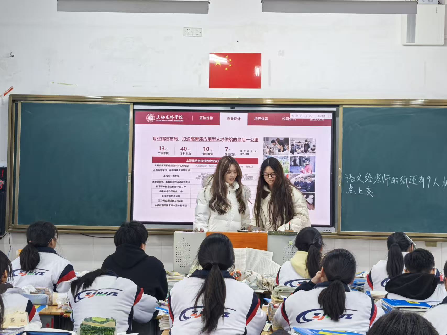 宣讲当天,两位学子带着上海建桥学院准备的PPT、宣传资料以及特色文创,步履轻盈地走进熟悉的教室。当她们站上曾经朝夕相处的讲台,望着台下一双双充满好奇与向往的眼睛,仿佛看到了一年前那个对大学满怀憧憬、奋力拼搏的自己,心中既有几分紧张,更有满满的激动与期待。“能以建桥学子的身份回到母校,站在曾经的讲台上,为学弟学妹们分享我们的大学经历,这份感觉既珍贵又有意义。”倪婴姿坦言,重返母校的那一刻,所有的陌生与拘谨都化为了亲切与坚定,也更加明确了此次宣讲的初心——用自己的亲身经历,为学弟学妹们拨开择校迷雾,指引前行方向。