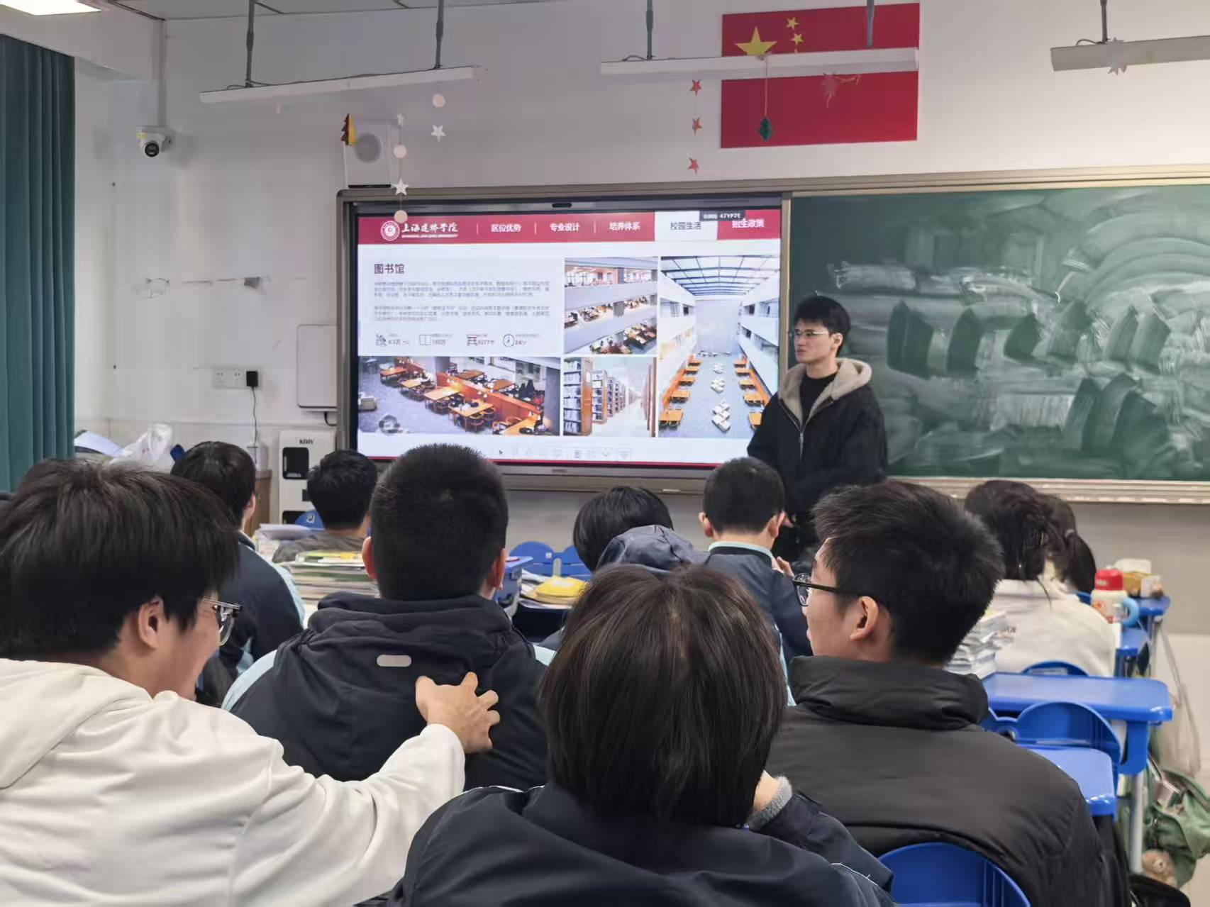 宣讲筹备阶段,宋鑫主动与高中对接人许意达老师取得联系,得知许老师对此次活动高度重视,第一时间协调了高三年级各班班主任,提前通知学子们梳理自身困惑、做好提问准备。随后,宋鑫与黄鑫怡、顾毅诚、徐泽旸三位同学反复沟通,结合高境第一中学的办学特色、学子升学需求,以及四人不同的专业背景,精心梳理宣讲框架,逐一打磨五大核心讲解内容,补充了大量贴合上海学子、贴合各专业的实用细节——既有会计专业的实训场景,也有数艺专业的创作案例,更有养老服务、商日专业的特色优势,只为让宣讲更接地气、更具针对性。重返校园的那一刻,四人快速卸下紧张,带着最饱满的状态,走进教室,开启了这场专属的青春分享。