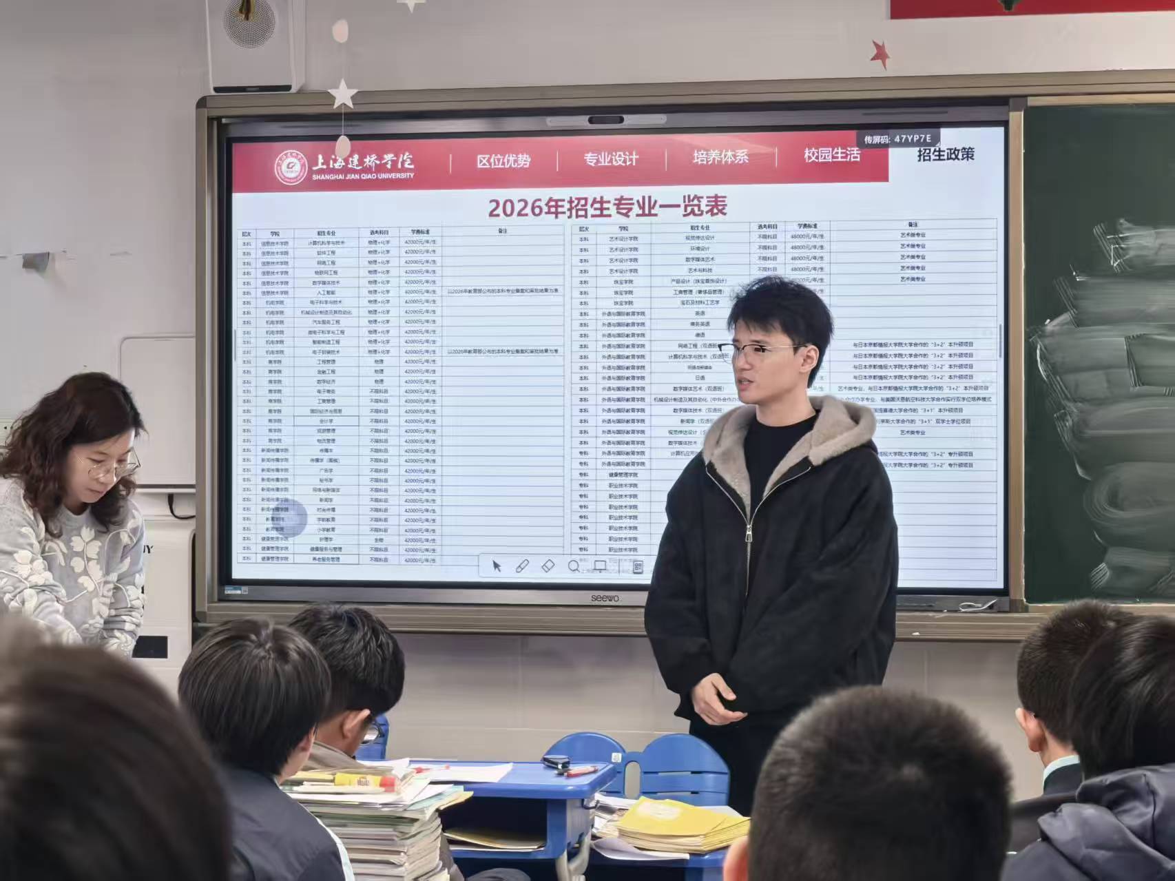 结合自身专业,四位学子展开详细分享:宋鑫作为此次宣讲的主导者,聚焦建桥商科优势,详细解读了会计专业“理论+实训+考证”的三位一体培养模式,介绍了会计电算化、模拟报税等实训课程,以及企业导师授课的特色,还分享了建桥会计专业2025年在沪433分的本科录取最低分,让学弟学妹直观了解专业实力;黄鑫怡重点分享养老服务专业的优势,详解“医工融合”的培养模式、实训基地建设,以及社区志愿服务、养老机构实习等实践安排,展现了该专业的广阔发展前景;顾毅诚补充介绍商日专业,讲解双语教学、中日学分互认项目的特色,重点说明专业对日语应用能力与商务素养的培养,为学弟学妹们解读考研、留学、就业的多元方向;徐泽旸则精准契合高境一中“艺术见长”的办学特色,结合学院“联创工坊”等实训平台、先进设备及与50余家企业的合作资源,现场展示自身实训作品,详解数艺专业“技术+艺术”的复合培养方向,让热爱艺术的学弟学妹眼前一亮。